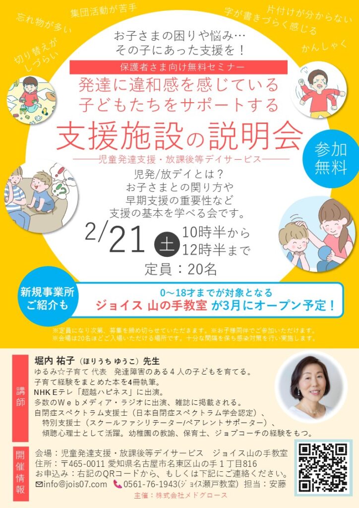 当日は、ご自身も発達障害のある4人のお子さまを育てたご経験から、書籍の執筆やNHK出演をはじめ、多数のWebメディア・ラジオへの出演歴をお持ちの堀内祐子先生をお招きし、早期支援の重要性やお子さまとの関わり方についてお話しいただきます。